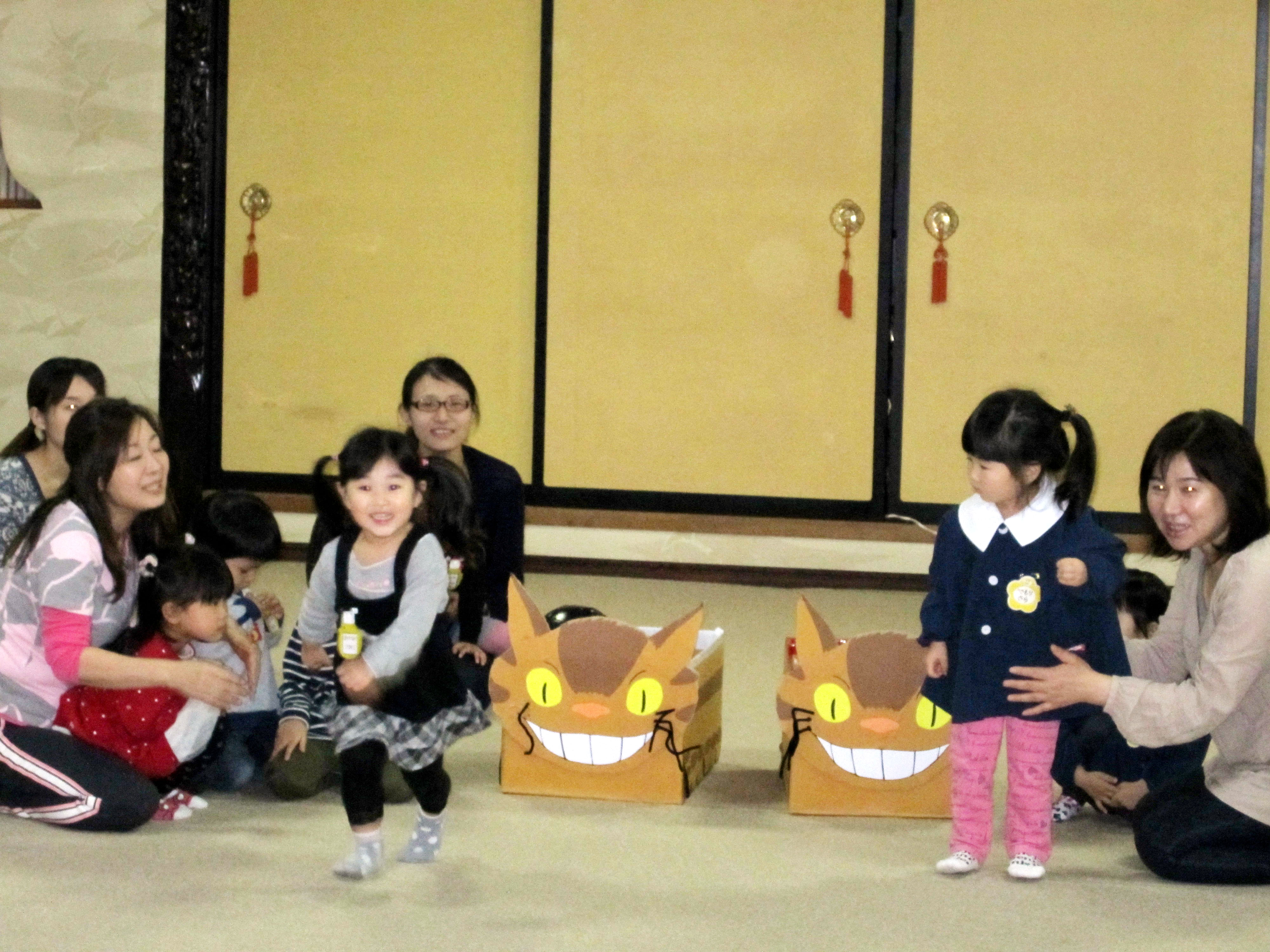 リングをとんとんはねたよ。 ネコバスにまっくろくろすけボールを入れて競争したよ。